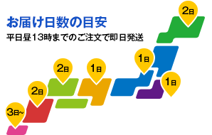 配達に掛かる日数は、日本全国ほとんどの地域が1〜2日となっています。